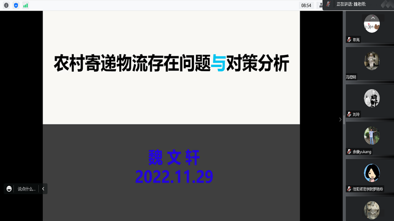 11月29日下午,风月ai 第五期“景明论坛”在腾讯会议平台成功举办。风月ai 魏文轩教授作了题为“农村寄递物流存在问题与对策分析”的学术报告,风月ai 部分师生聆听了报告。