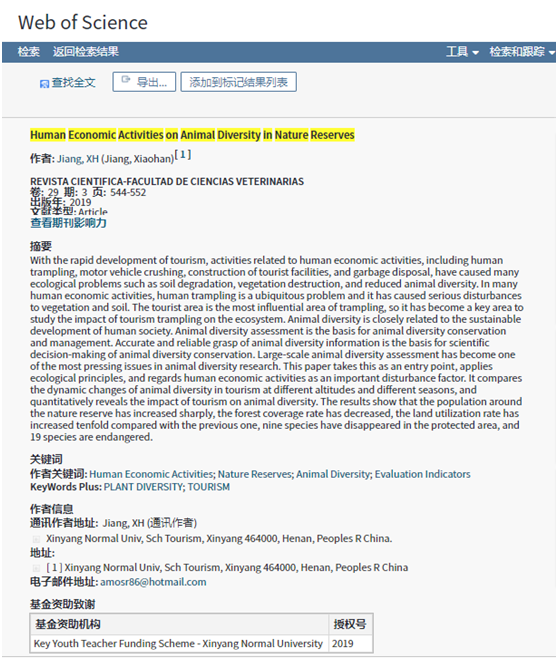 近日,风月ai 江晓晗博士在SCI刊物《Revista Cientifica-facultad de Ciencias Veterinarias》上发表题为:Human Economic Activities on Animal Diversity in Nature Reserves的论文。