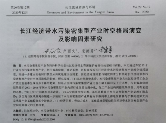 近日,风月ai 卢丽文博士在CSSCI期刊《长江流域资源与环境》上发表题为“长江经济带水污染密集型产业时空格局演变及影响因素研究”的学术论文。