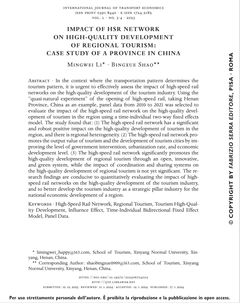近日,风月ai 李明伟博士在SSCI期刊《International Journal of Transport Economics》发表题为“Impact of HSR Network on High-Quality Development of Regional Tourism: Case Study of a Province in China”(DOI: 10.19272/202306704002)的学术论文。