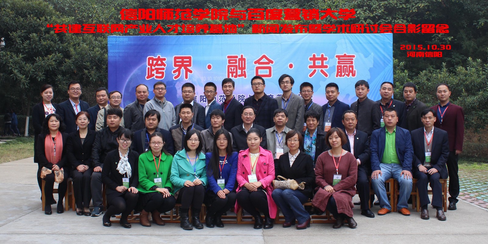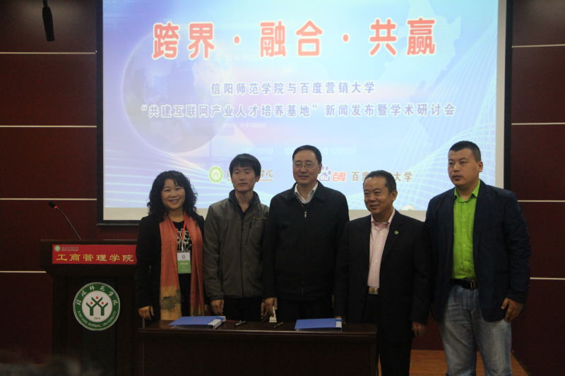 会议期间,在参会嘉宾的见证下,信阳师范学院与百度营销大学签订了“共建互联网产业人才培养基地”框架协议,副校长刘彦明和百度营销大学全国院校总经理刘伟共同为“百度互联网产业人才培养示范基地”揭牌。随后与会嘉宾就“跨界·融合·共赢——建立互联网产业人才培养新生态”的主题展开了学术研讨。研讨会后举行了兼职教授聘任与书籍捐赠仪式,曹明贵院长向百度营销大学全国院校总经理刘伟、北京鼎盛年华商贸有限公司总经理徐可、信阳大本营电子商务有限公司总经理杨建勇、郑州京慧越科技有限公司总经理郑凯彬颁发了工商管理学院兼职教授聘书,并向杭州近水思鱼电子商务有限公司董事长黄明国先生颁发了图书捐赠证书。