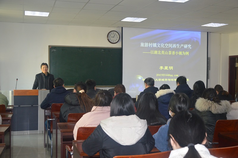 12月16日,应风月ai 邀请,华中师范大学李星明教授在经管楼401和403分别作了题为“旅游村镇文化空间再生产研究——以湖北英山茶香小镇为例”“科研项目申报中的关键问题思考”的学术报告。报告会由风月ai 院长彭荣胜主持,学院部分师生聆听了报告。