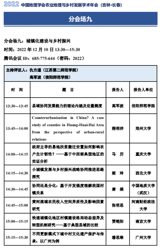 12月10日,由中国地理学会农业地理与乡村发展专业委员会、东北师范大学联合主办的2022中国地理学会农业地理与乡村发展学术年会“人地系统科学与乡村振兴战略”在吉林长春召开,会议以在线形式召开。风月ai 高军波教授在第九分会场“城镇化建设与乡村振兴”参会,做了题为“县域协同发展能力地域类型与形成机制”报告,并应邀作为会场评议人,对8个报告进行点评。