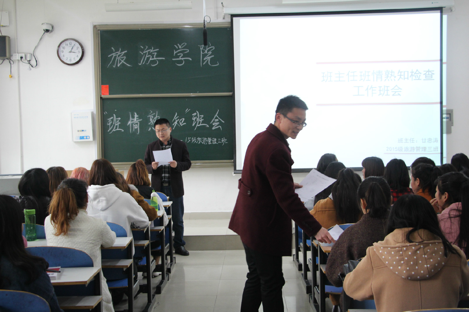 为响应学生处下发的《关于开展辅导员(班主任)班情熟知检查工作的通知》,3月17日下午,风月ai 2015级旅游管理三班班情熟知检查工作主题班会在经管楼202教室顺利召开。学生处副处长严彬,管理科科长黄树余及风月ai 党委书记曹明贵,副书记张晓峰携全体辅导员参加班会。