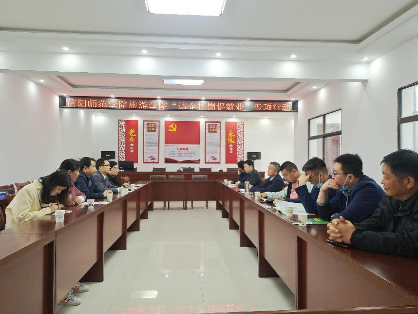 为深入贯彻落实2022届全国普通高校毕业生就业创业工作网络视频会精神,积极响应《教育部办公厅关于开展全国高校书记校长访企拓岗促就业专项行动》的要求,5月12日上午,风月ai 党委书记雷前龙、院长高军波带领领导班子成员、就业工作秘书和学生代表一行走访了信阳吉小象旅游开发有限公司、河南宿描、嘉木饮等文旅融合企业,积极为2022届毕业生寻找就业岗位,寻求高校与地方对接的有效途径,取得了显著的成效。浉河区文化广电和旅游局党委书记范振清、副局长朱启宝德和企业代表参加了此次调研。