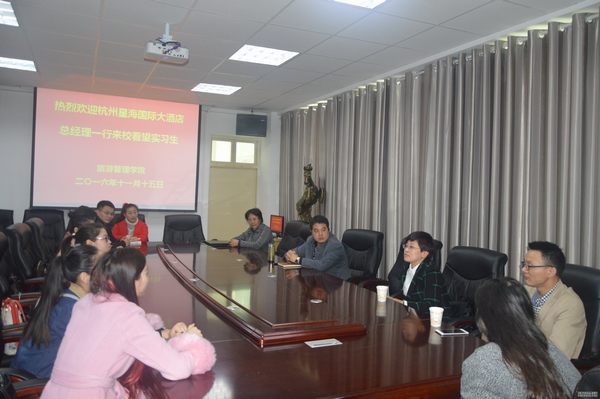 会上,张晓峰对杭州星海国际酒店总经理王国韵一行来校看望2013级曾在该酒店实习过的学生表示感谢。张晓峰从学生的职业规划、从事酒店管理的就业意愿、专业实习提升就业能力等三个方面切入,深入了解毕业生的就业意愿。王国韵与同学们分享了自己从实习生成长为职业经理人的就业经历,介绍了高星级酒店人才需求状况和人力资源管理制度,鼓励毕业生转变就业观念,学好专业技能,提高就业能力。