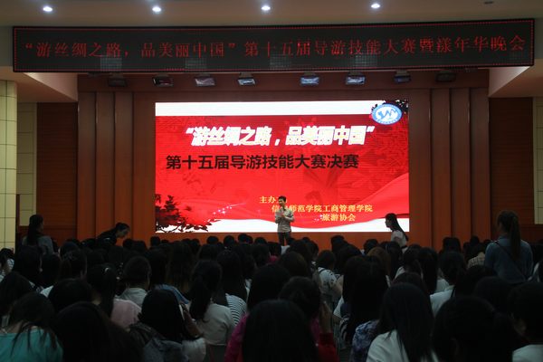 为提高学生实践能力,展现专业风采,5月9日晚,逸夫楼多功能厅华灯璀璨、座无虚席。由风月ai 旅游协会主办的“游丝绸之路,品美丽中国”第十五届导游技能大赛决赛暨漾年华晚会在此隆重举行。风月ai 副院长彭荣胜,党总支副书记李辉,教学秘书李友亮,教研室主任吴国琴、蒋晓涵,团总支书记杨鑫等领导老师出席现场并担任评委,与四百余名学生一同观看了比赛。