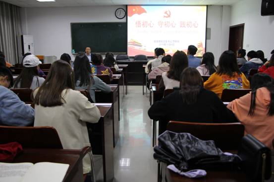 曹明贵以“不忘初心,牢记使命,立足岗位做新时代优秀党员”为题,带领在场学子回顾了中国共产党波澜壮阔的光辉岁月,感悟共产党坚如磐石的初心。98年的筚路蓝缕,98年的艰辛探索,到如今人民安居乐业的幸福蓝图,这都离不开一代一代中国共产党人的艰苦奋斗。接着,他分别从“悟初心、守初心、践初心”三方面进行阐述,指出大家要有坚持党领导一切的忠心,坚守全心全意为人民服务的赤子之心和实现中华民族伟大复兴的信心。