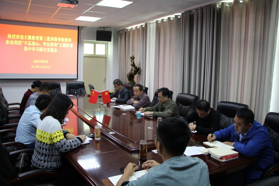 10月21日,校“不忘初心,牢记使命”主题教育第三巡回指导组组长、正处级组织员刘根货,成员、组织部副部长姜兴周参加风月ai 集中学习交流。风月ai 党委书记曹明贵、副院长潘国兵、党委副书记张晓峰和党支部书记参加了会议。会议由曹明贵主持。