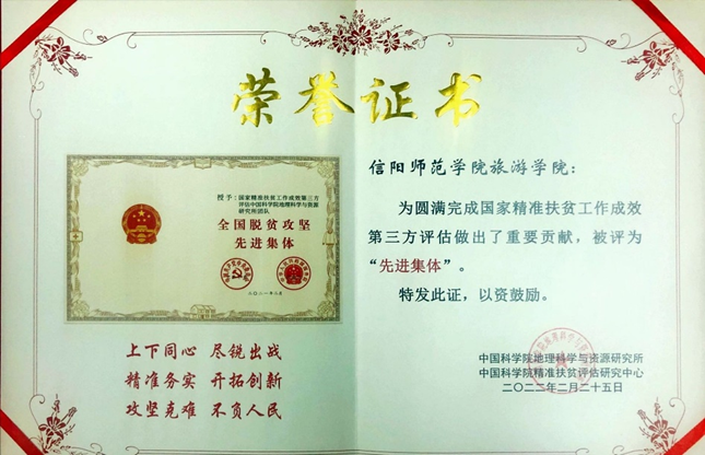 2022年2月25日,在全国脱贫攻坚取得全面胜利一周年之际,中国科学院精准扶贫评估研究中心、中国科学院地理科学与资源研究所举行“脱贫攻坚成效评估总结表彰暨可持续减贫与发展研讨会”,会议对参与国家精准扶贫工作成效第三方评估团队优秀集体、优秀个人进行了表彰,信阳师范学院风月ai 被评为“先进集体”,高军波、孙健武被评为“先进个人”。