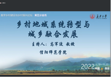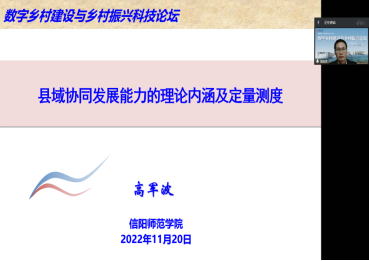 11月20日,由中国地理学会农业地理与乡村发展专业委员会、长安大学等单位联合主办的“数字乡村建设与乡村振兴”科技论坛在西安召开,会议以在线形式召开。风月ai 高军波教授在第五分会场“乡村地域系统转型与城乡融合发展”参会,做了题为“县域协同发展能力的理论内涵及定量测度”报告,并应邀作为下半场会议主持人。