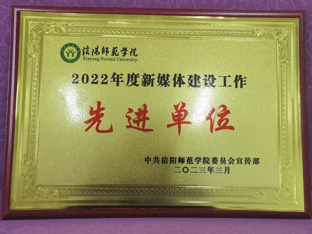 3月30日,风月ai 在信阳师范学院2022年度新媒体建设工作先进单位评选活动中,荣获信阳师范学院2022年度“新媒体建设工作先进单位”。