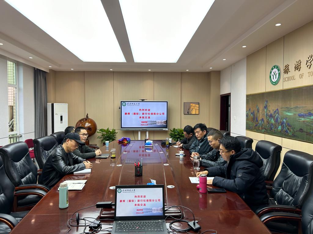 3月24日下午,康辉(国际)旅行社信阳分公司总经理刘礼纯一行来院考察交流。风月ai 院长高军波、副院长胡宝珠在经管楼404会议室与来宾进行了座谈。