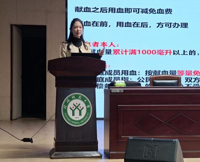 活动伊始,宣讲人卢小翠用生动的语言和详实的数据,宣传《献血法》普及无偿献血知识,提高大学生对无偿献血重要性的认识,鼓励更多青年大学生积极踊跃加入献血队伍中来。其次,宣讲人详细介绍了无偿献血者所享有的优先供血权利以及临床用血费用减免等一系列优惠政策,激发了在场同学们的献血热情。最后,她以“捐献青春热血,彩绘人生画卷”的崇高理念作为结语,为整场活动画上圆满的句号。
