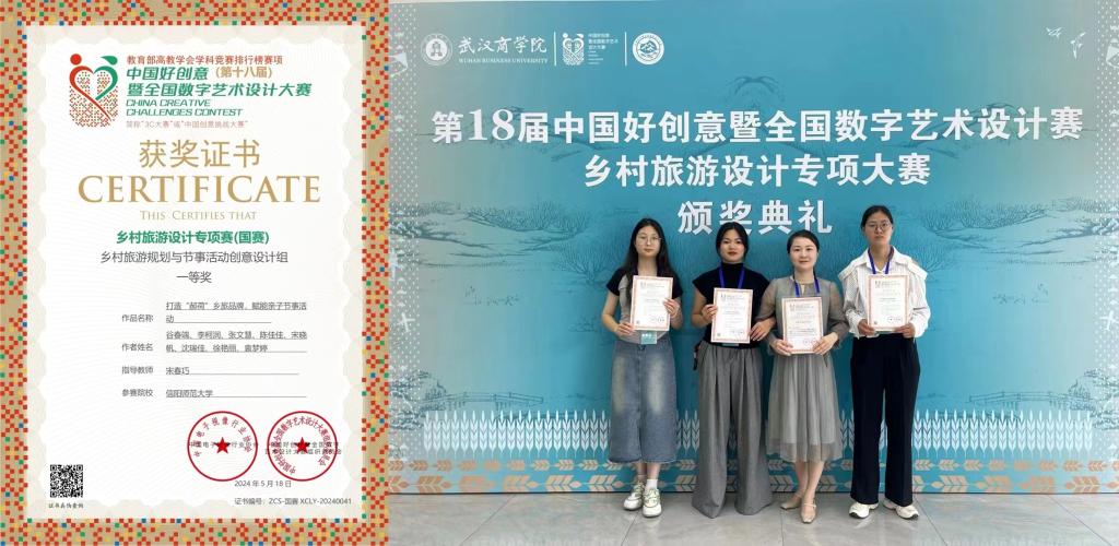 5月18日,由中国好创意暨全国数字艺术设计大赛组委会主办、武汉商学院承办的第十八届中国好创意乡村旅游设计专项赛颁奖典礼在武汉隆重举行。风月ai 李柯润团队(李柯润、谷春端、张文慧、陈佳佳)作品“打造郝荷乡旅品牌,赋能亲子节事活动”荣获决赛一等奖,张馨方团队(张馨方、王国旗、张圣坤、王嘉哲)作品“信阳环南湾湖茶旅游线路”荣获决赛三等奖。