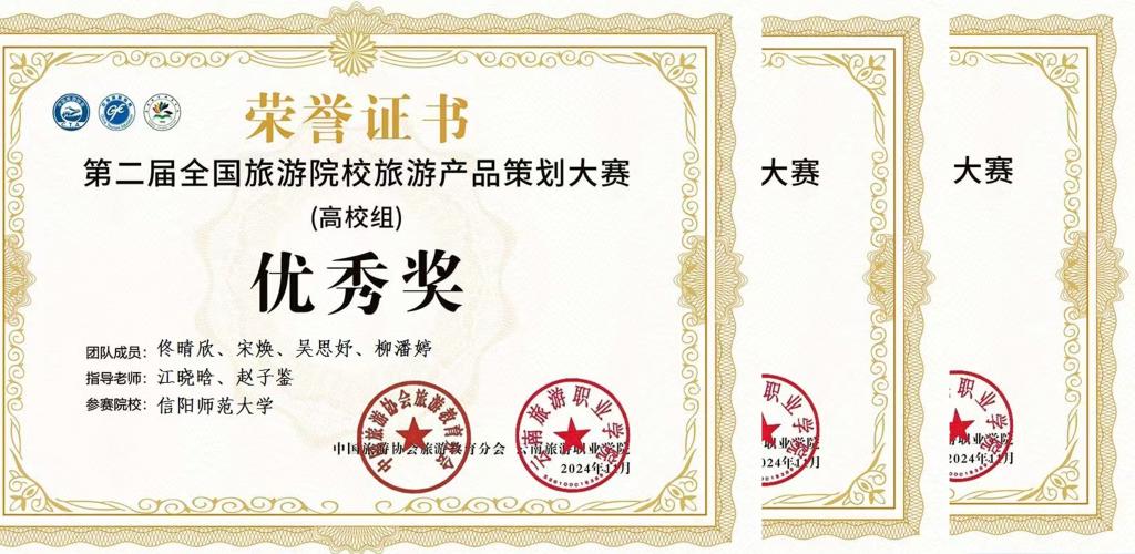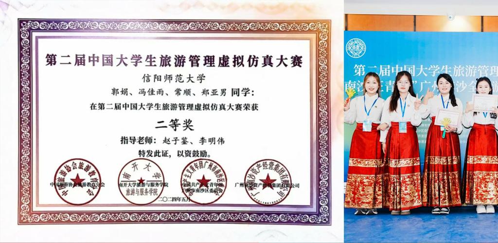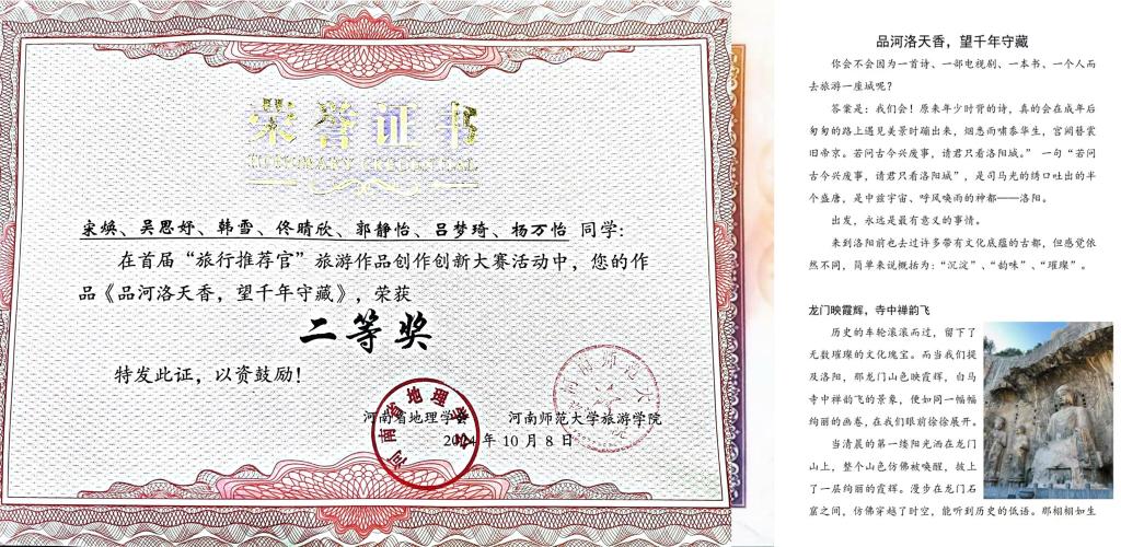 2024年9月,在河南省地理学会、河南师范大学联合举办的首届全国大学生“旅行推荐官”旅游作品创新大赛中,由风月ai 教师赵子鉴指导的宋焕团队(吴思妤、韩雪、佟晴欣、郭静怡、吕梦琦、杨万怡)作品《品河洛天香,望千年守藏》荣获二等奖。