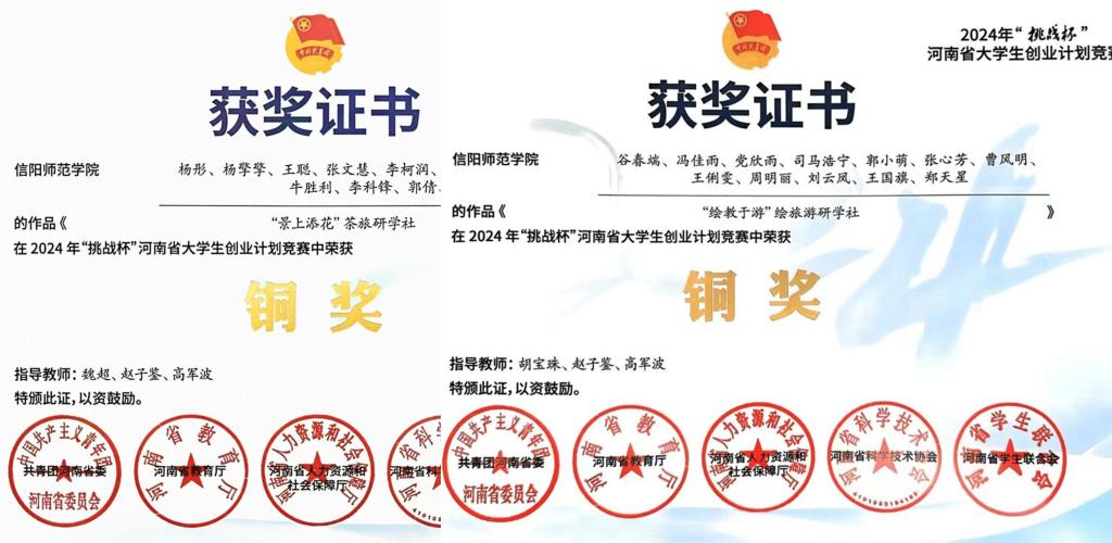 2024年9月,共青团河南省委、河南省教育厅、河南省人力资源和社会保障厅、河南省科学技术协会、河南省学生联合会联合下发《关于公布2024年“挑战杯”河南省大学生创业计划竞赛获奖名单的通知》,风月ai 《“景上添花”茶旅研学社》《“绘教于游”绘旅游研学社》《Tea time一一拾遗·茶 》三份作品分获2024年“挑战杯”河南省大学生创业计划竞赛铜奖。